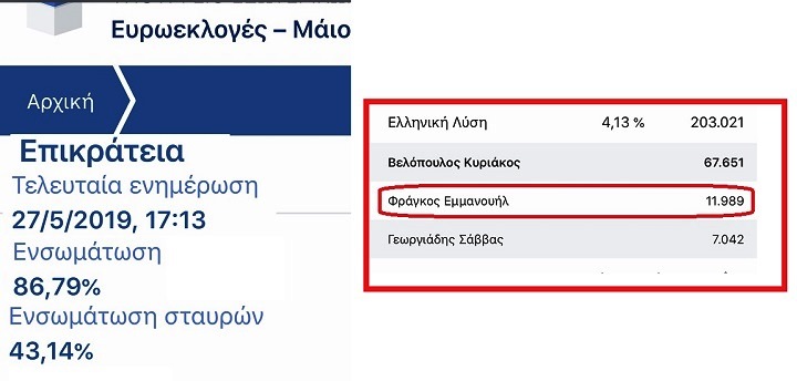 12.000 εκλογείς! Με αποτέλεσμα να βγεί δεύτερος σε ψήφους στο κόμμα του, και εάν επιβεβαιωθούν οι φήμες πως ο Βελόπουλος ( πρώτος) δεν θα γίνει Ευρωβουλευτής, ο συγκεκριμένος κύριος ΦΡΑΓΚΟΣ ( ΦΡΑΓΚΟΥΛΗΣ ) ΕΜΜΑΝΟΥΗΛ,